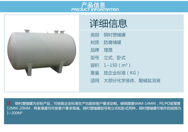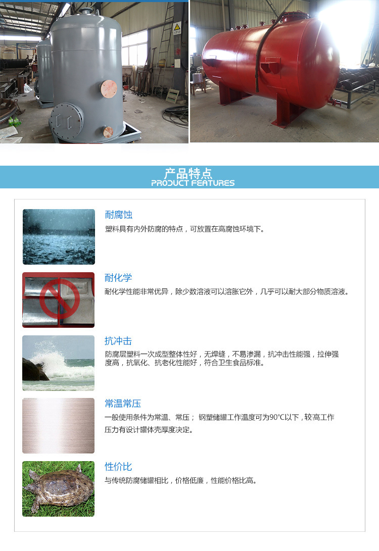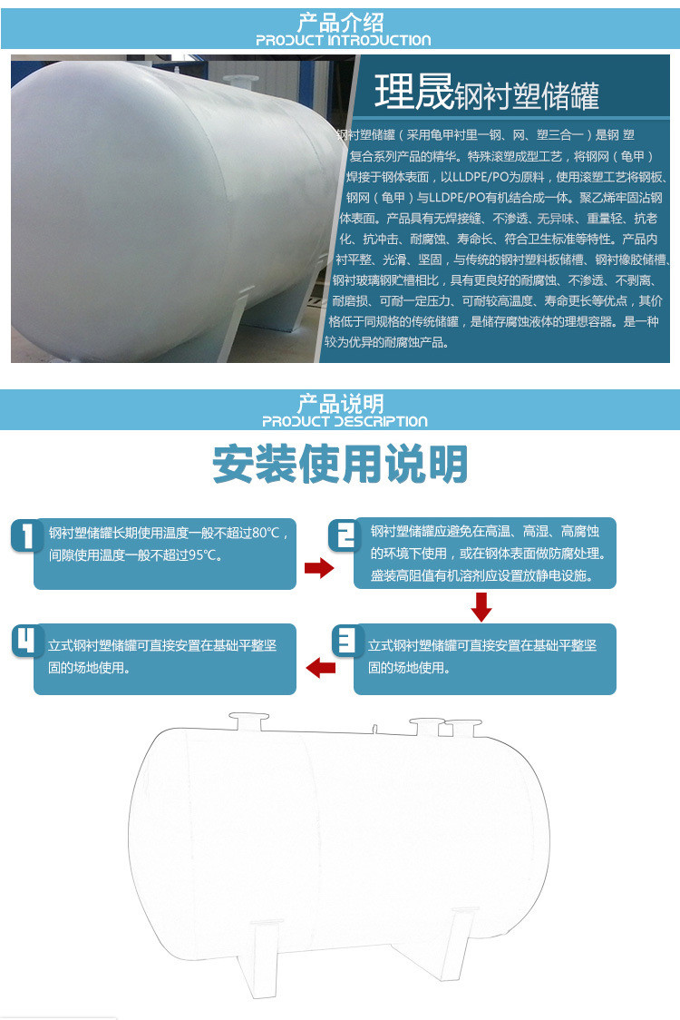 10、鋼襯塑PE/po儲罐,應避免在高溫、高濕、高腐蝕的環境下使用。